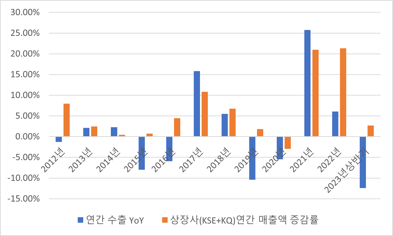 [ 연간 수출 증감률과 상장사 매출액 증감률. 자료 분석 : lovefund이성수 ]