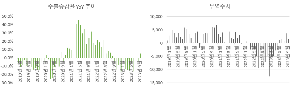 13개월 만에 수출이 플러스로 돌아섰습니다. 코로나 팬데믹 이후 기저효과로 인하여 2021년과 2022년 상반기에 폭증하였던 수출은 2022년과 2023년 기고효과와 미·중 갈등 등 복합적인 이유로 수출이 역성장하였습니다. 그러다 보니 상장사들의 매출이 위축되는 등 아쉬운 실적이 연이어 나타났습니다.