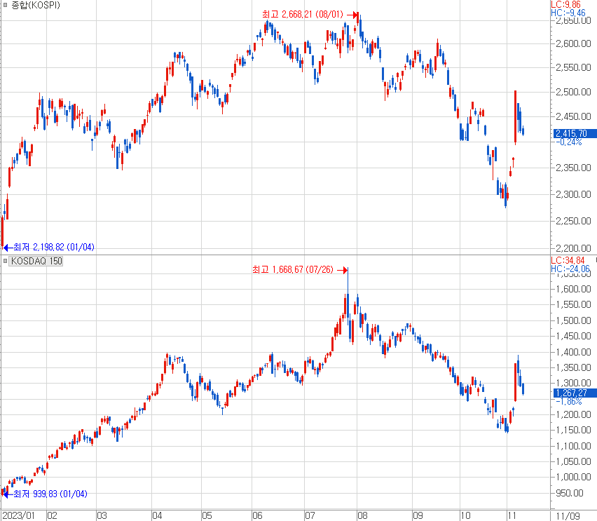 [ 코스피 종합지수와 코스닥150지수 추이를 살짝 살펴보면 ]