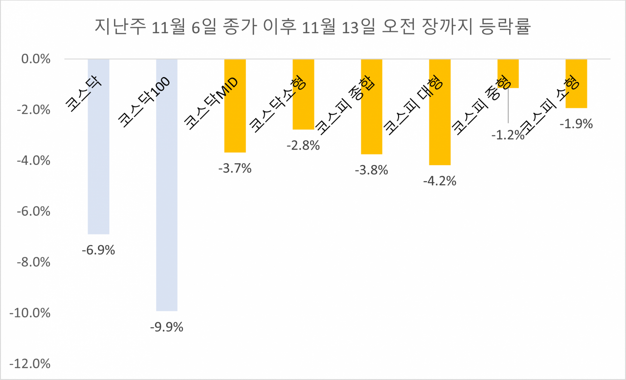 [ 지난주 11월 6일 종가 이후 11월 13일 오전장까지 주요 지수 등락률 비교 ]