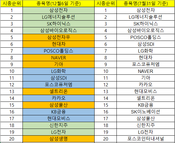 위의 표는 12월 6일 기준 시가총액 순위와 7월 말 기준 시가총액 순위를 비교한 자료입니다. 녹색으로 표시한 영역은 순위가 변화하지 않은 종목이고, 주황색 영역은 시총 순위가 상승한 종목 그리고 진한 남색으로 영역표시가 된 종목은 시총 순위가 하락한 종목입니다.