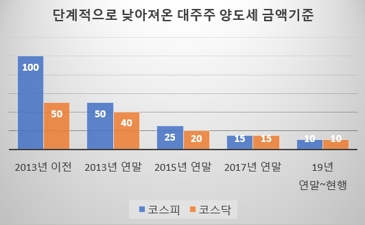 [ 2013년 연말부터 단계적으로 낮아져 온 대주주 양도세의 금액 기준 ]