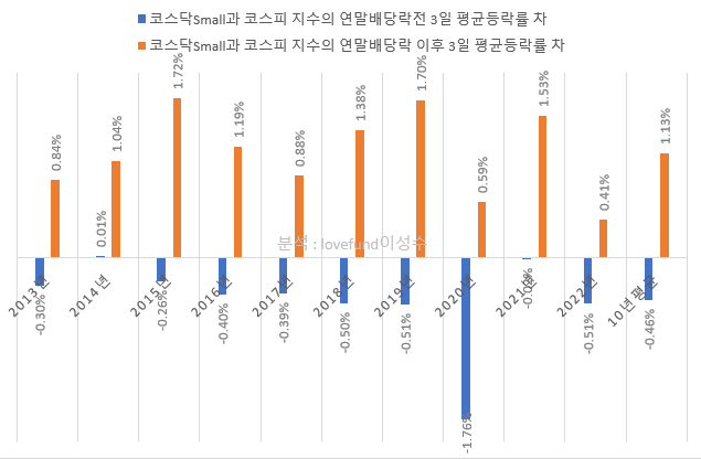 [ 코스닥Small지수의 코스피 종합지수 대비 연말 배당락 전후 3일간의 평균 등락률, 분석 : lovefund이성수 ]