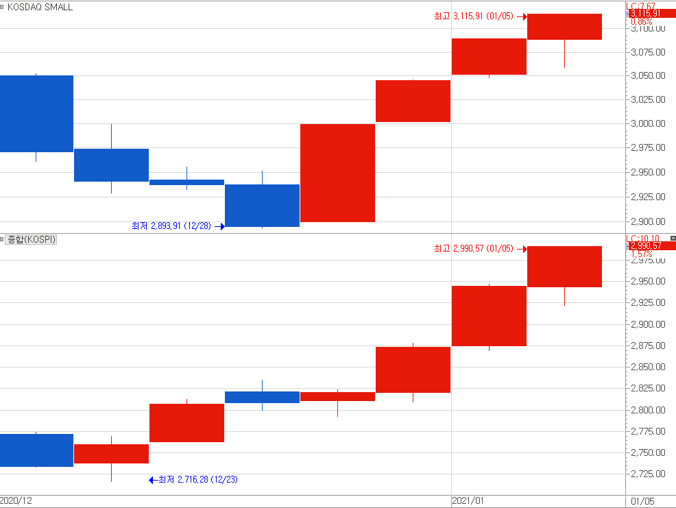 [ 2020년 연말 코스닥Small지수(위쪽)와 코스피 종합지수(아래쪽) ]