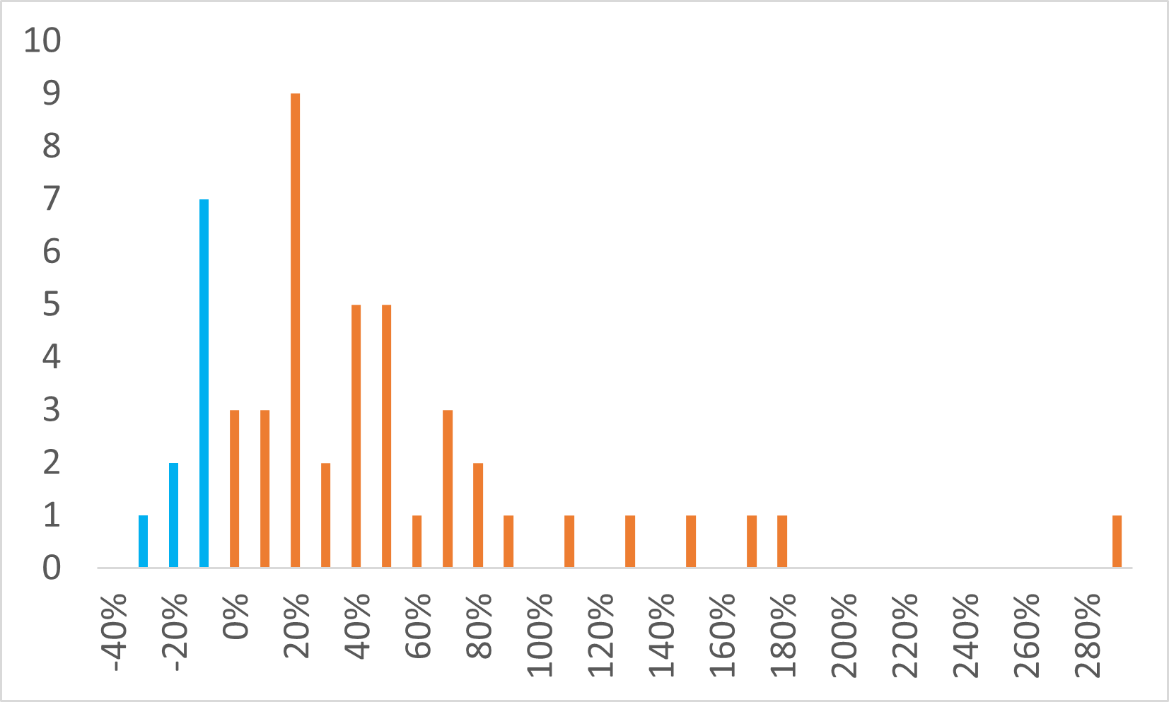 [ 2020년 2월 세팅되고 3년 10개월 방치된 포트폴리오의 종목별 수익률 히스토그램 ]
