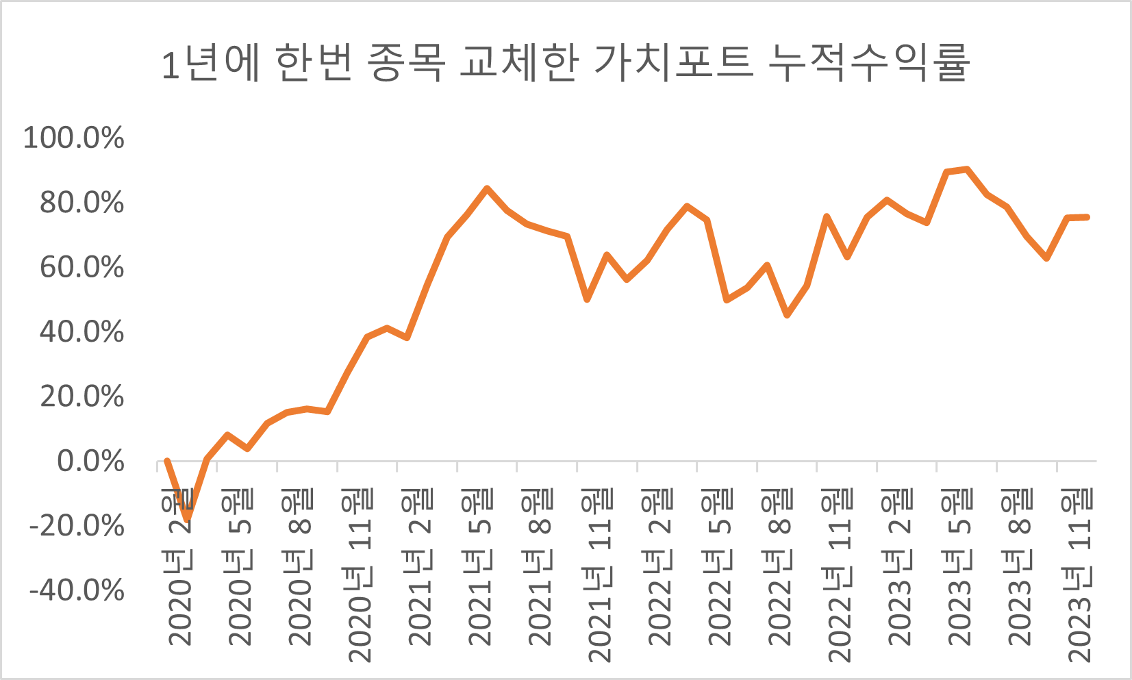 앞서 3년 10개월간 방치된 가치 포트폴리오의 누적 수익률은 38.2%였습니다만 이에 반하여 1년에 한 번씩 주기적으로 같은 가치투자 기준으로 종목을 바꾼 가치 포트폴리오는 75.4%라는 높은 성과 거두었습니다.