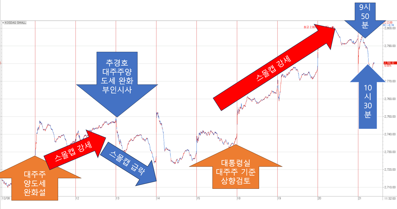 1) 대략 열흘 전인 12월 둘째 주에 대주주 양도세 기준이 완화될 것이라는 뉴스와 시장 기대가 형성되었습니다. 그 결과 12월 11일과 12일에 중소형주(참고 KOSDAQ Small 지수)는 제법 강한 흐름이 나타났습니다.
