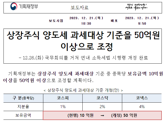 일단 12월 9일~10일 주말을 보내면서, 대주주 양도세 기준 완화가 시장에 돌았습니다만, 며칠 뒤인 지난주 12월 12일(화)에 추경호 경제부총리가 대주주 양도세 완화를 구체적으로 검토하고 있지 않다는 발언을 하면서 다음날 증시에 올해 마지막 대주주 양도세 기준에 해당하는 물량이 쏟아졌고, 이후 일주일 동안은 대주주 양도세 기준이 완화될 것이라는 청와대발 뉴스가 이어지면서 시장 기대가 발생하였습니다. 그리고 오늘 10시 30분 언론매체들은 속보로 대주주 양도세 기준 50억 원 상향을 보도하였습니다.