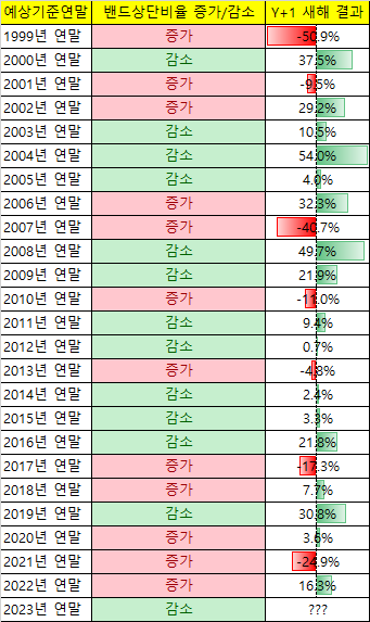 위의 표는 밴드상단비율(예상 지수 상단과 연말 지수 비율) 의 전년 대비 증가/감소 추이와 다음 해 주가지수 결과를 보여주고 있습니다. 밴드 상단 비율의 증가는 1999년부터 2022년까지 총 12번의 사례가 있었고 이 중 7번이 증시 하락이 나타났습니다. 58% 정도의 비율로 상단 밴드 확대와 달리 엇갈린 결과가 나타난 것이지요. 다만, 58%의 비율로는 그렇게 결정적인 의미를 가지기에는 애매할 수 있습니다.