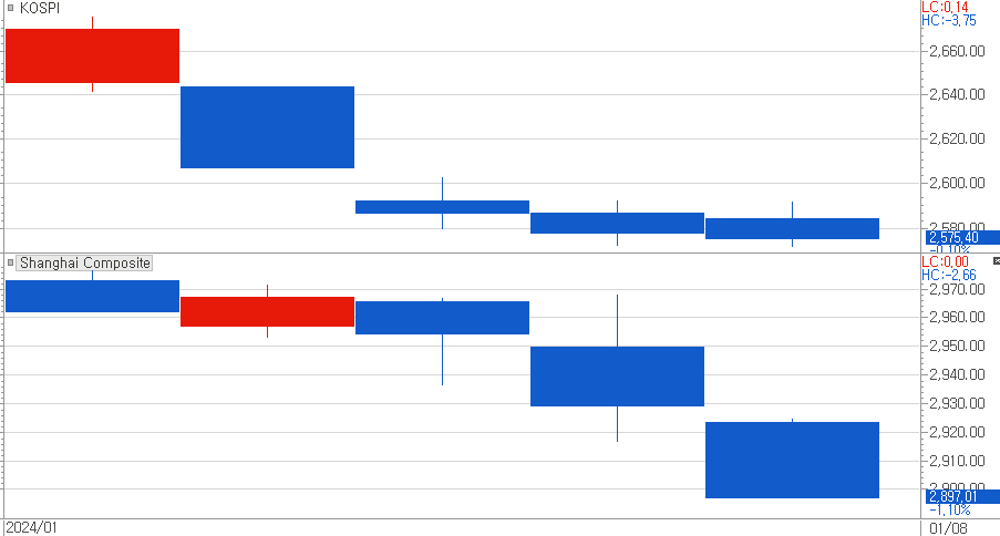 [ 2024년 한국 코스피와 중국 상해 종합지수 추이 ]