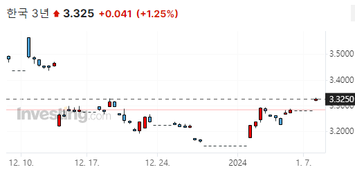 [ 한국 국채 3년 금리 추이. 자료 : 인베스팅 ]