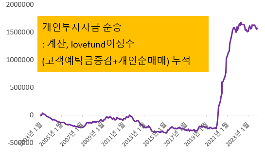[ 2003년 이후 최근까지 개인 투자자금 순증 누적 추이. 분석 : lovefund이성수 ]