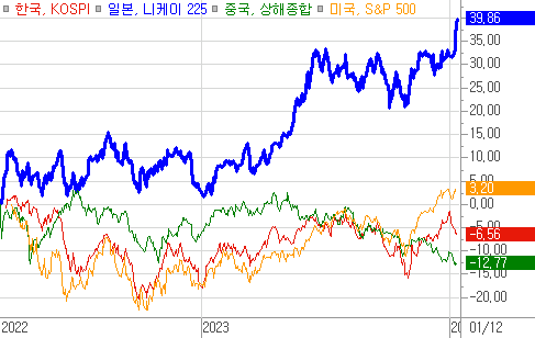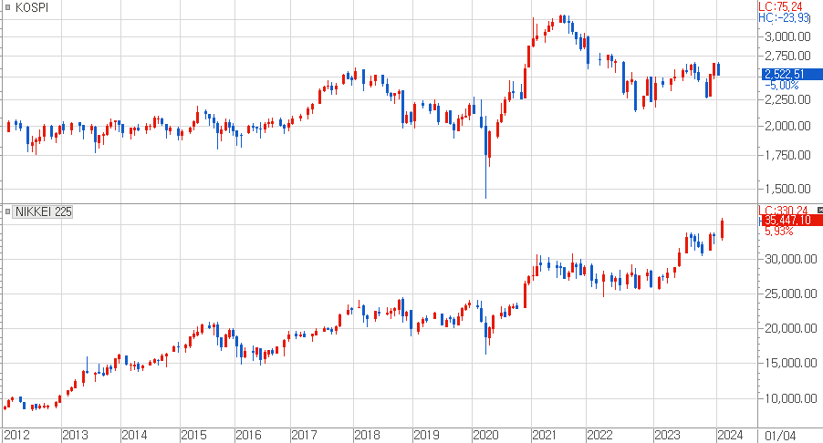 이웃 나라이지만 한국과 일본은 라이벌 관계에 있다 보니, 일본이 한국보다 앞서나가면 한국인으로서 참으로 힘들지요. 그러하기에 주식시장이 10년 넘게 일본에 뒤처져있는데 새해 벽두부터 정반대로 움직이다 보니 계속 눈에 들어오지 않을 수 없습니다.
