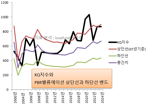 [ 2000년 이후 최근까지 코스닥지수와 PBR 밴드 추이. 원자료:KRX / 분석 : lovefund이성수 ]