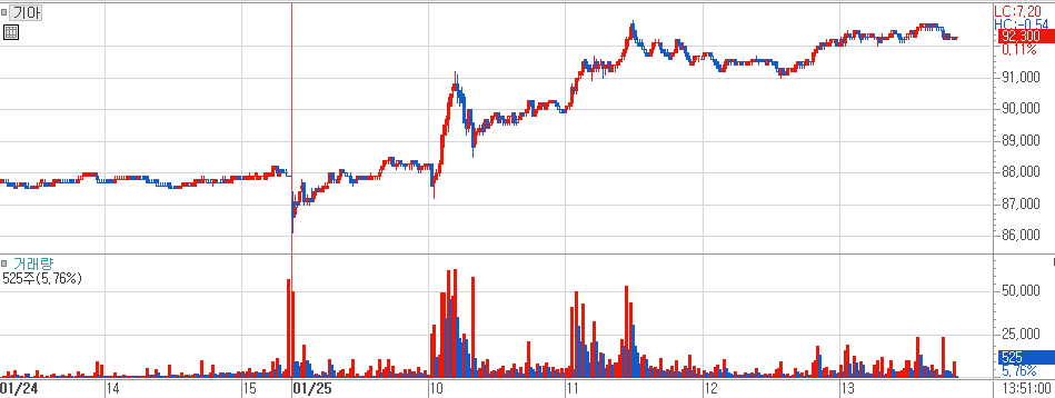 [ 자사주매입소각 등 이슈 이후 장중 강세를 보이는 기아의 분봉차트 ]