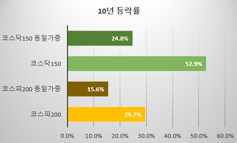 코스닥150지수의 경우 시가총액 방식의 지수는 10년간 52% 넘게 상승하였습니다만, 동일 가중 지수는 24.8% 상승하였고, 코스피 200지수의 경우 시가총액 방식의 지수는 29.7% 상승하였습니다만, 동일 가중 방식은 15.6% 상승한 정도였습니다.