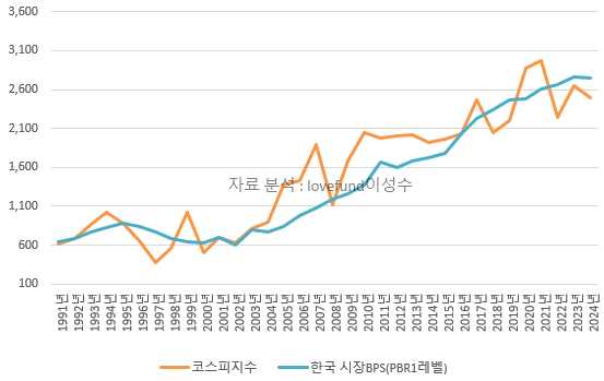 위의 표는 1990년 이후 최근까지 코스피 종합주가지수와 코스피 시장의 BPS(PBR 1레벨)를 함께 그려 필자가 분석 자료입니다. 한눈에 보시더라도 2000년대 이후부터 2010년대 중반까지는 PBR 1레벨 위에서 뛰어놀던 시간이 많았던 것과 달리, 2010년대 후반 이후 코스피 지수는 PBR 1 미만에 있는 시간이 너무도 길어졌습니다.
