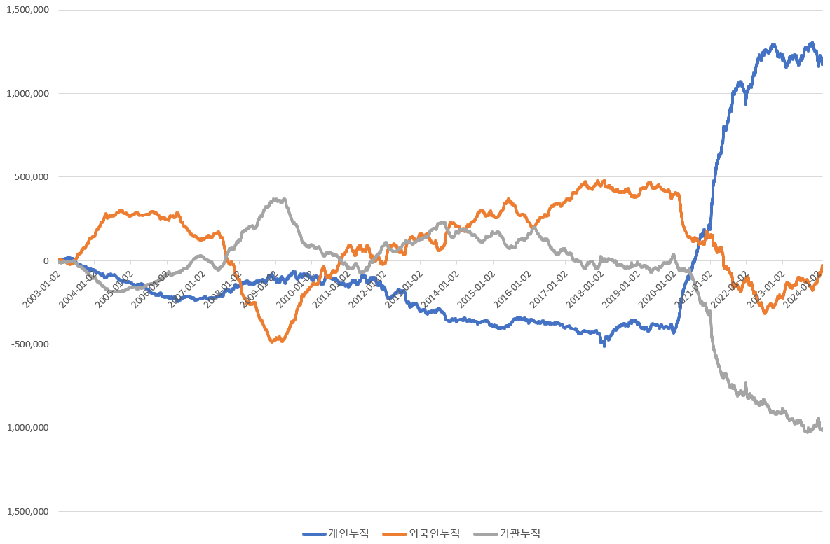 [ 2003년 이후 개인과 기관 그리고 기관의 누적 순 매매 추이. ]