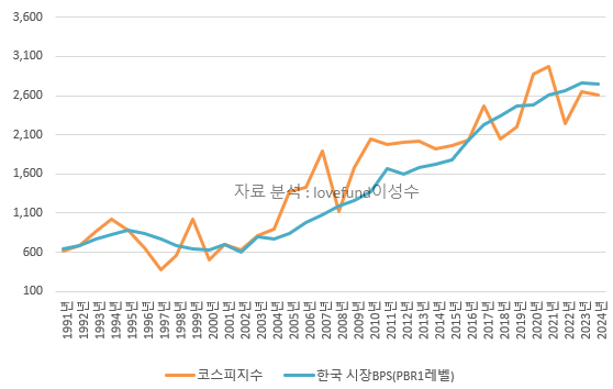 [ 주가지수와 PBR 1레벨 추이. 자료 분석 : lovefund이성수, 원자료 참조 : KRX ]