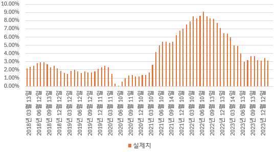 [ 미국 소비자물가지수(CPI) 전년 비 추이. 원자료 참조 : 인베스팅 ]
