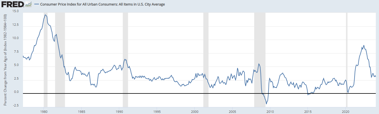 [ 1980년대 이후 2023년 최근까지 미국 CPI YoY 추이. 자료 참조 : FRED ]