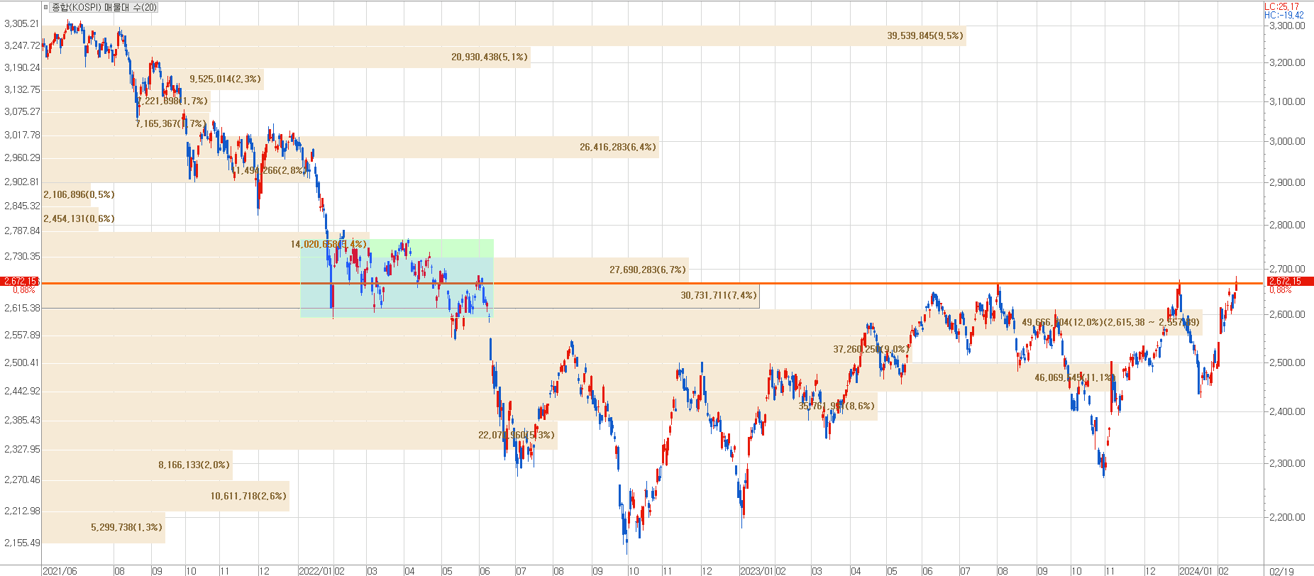 [ 코스피 매물대 차트 : 코스피 2,700p 영역은 2022년 연초 매물이 적체된 영역 ]