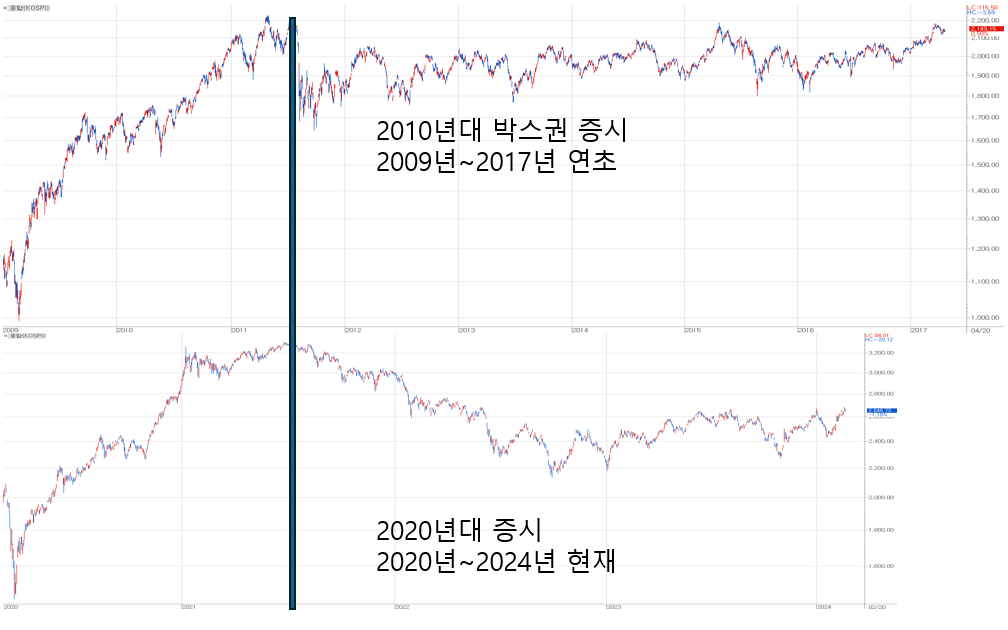 그래야만, 2020년대 현재까지의 증시가 2010년대와 비슷하다고 하더라도 이후에는 2010년대 횡보장과는 달리 상승 흐름을 꾸준히 만들 수 있기 때문입니다.