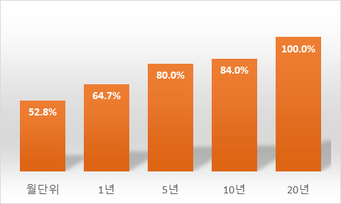 아래의 도표는 종합주가지수를 1990년부터 2019년까지 한 달, 1년, 5년, 10년, 20년 보유했을 때의 평균 승률을 정리한 자료입니다. 보유 기간이 짧을수록 승률은 50%(홀짝 놀이 확률) 가까워집니다만, 반대로 장기 보유할수록 승률은 절대적인 레벨인 100%에 근접하게 되지요.