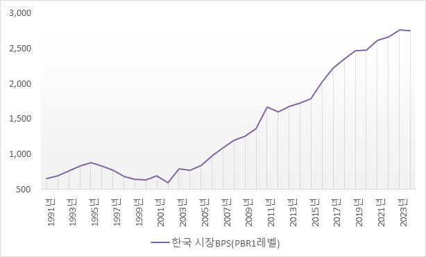 위의 도표는 1991년부터 2024년 최근까지 코스피 시장의 PBR 1x 레벨, 즉 코스피 시장 BPS를 보여주고 있습니다. IMF사태 전후로 기업가치가 급락한 시기는 있었습니다만, 이후 한국 상장기업들은 꾸준히 기업가치를 높이면서 500p에서 2,750p까지 꾸준히 그 수치를 높여왔습니다.