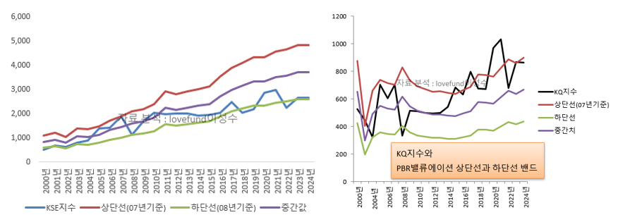 위의 자료는 2000년 이후 2024년 최근까지 코스피 PBR 밴드와 코스닥 시장의 PBR밴드를 함께 표시한 자료입니다. 한눈에 보시더라도 코스피(유가증권) 시장은 아직도 바닥 영역에 있어 있지만, 코스닥 시장은 과열된 영역에 들어가 있음을 한눈에 확인할 수 있습니다.