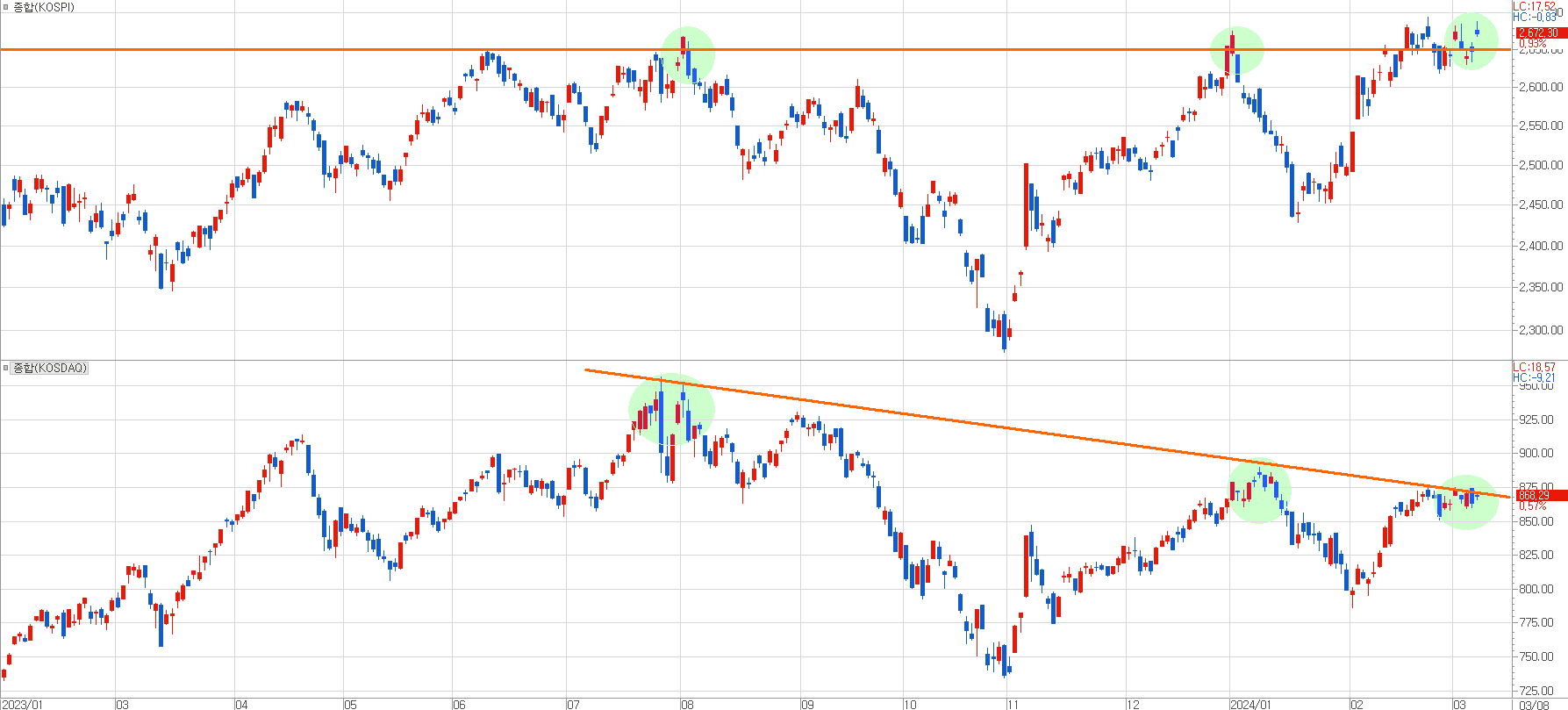 이에 반하여 코스피(유가증권) 시장은 코스닥(KQ)시장에 비하여 상대적으로 가볍습니다. 이미 지난 1월과 작년 여름의 고점 부근에 위치해 언제든지 넘어가려 하는 기세에 있으니 말입니다.