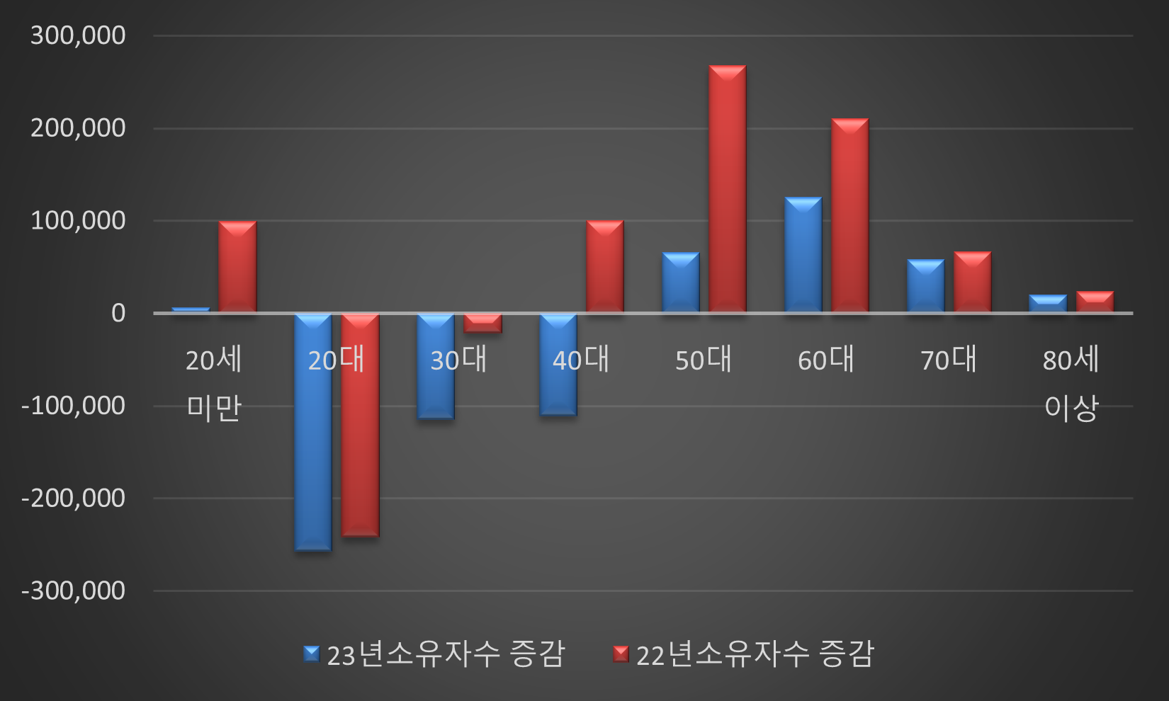 이번 주식투자자 인구 감소가 젊은 층을 중심으로 크게 나타났다는 점을 필자는 중요하게 지켜보고 있습니다. 20대와 30대의 소유자 수 감소는 37만 명에 이르니 말입니다.