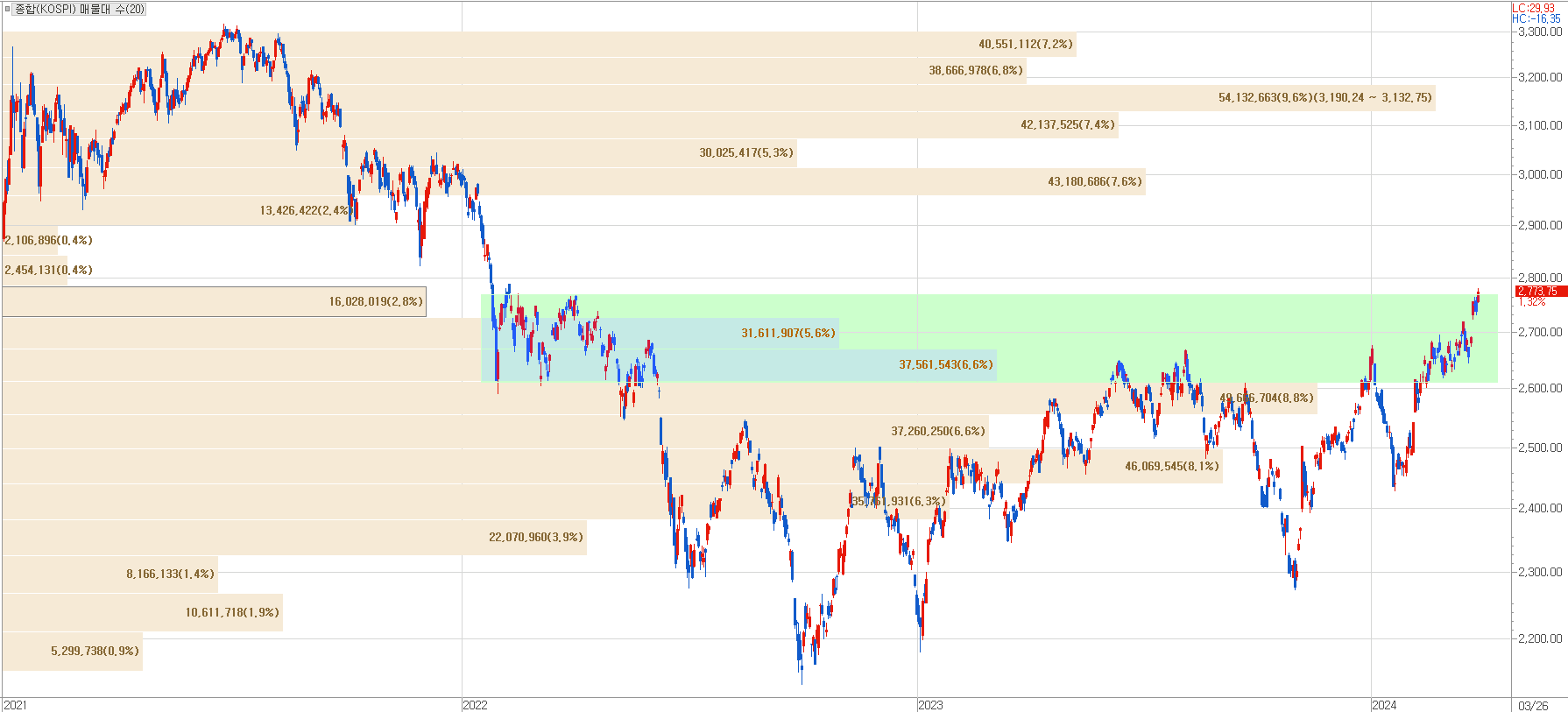 3월 중순 코스피 2,700p가 다시 열리는 과정에서 증시는 일진일퇴하면서 조금은 답답한 흐름이 있었습니다. 하지만 그 과정을 거친 이후 주식시장은 은근슬쩍 상승세를 높여가더니 급기야 주가지수 2,800p 눈앞까지 다가왔습니다. 그리고, 주식시장은 2년 전 2022년 1분기에 만들어졌던 악성 매물대(원귀 매물대)를 벗어났습니다. 투자자들이 눈치 못 채게 하려는 듯 조용히 말입니다.