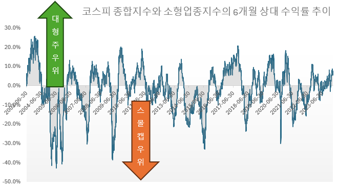 위의 도표는 종합주가지수의 6개월 등락률과 소형업종의 6개월 등락률의 차이를 분석한 자료입니다. 과거 2003년부터 1년여간 대형주 중심의 차별화 장세가 있었습니다만 이후에는 스몰캡 우위의 시장이 만들어졌던 사례, 2010년대 초반 차화정 장세로 대형주 중심의 장세가 있었습니다만 이후 제법 긴 기간 스몰캡 중심의 시장이 찾아왔던 시기를 시각적으로 확인할 수 있습니다. 굳이 시기를 구분하지 않더라도, 대형주 우위 시장과 스몰캡 우위 시장은 서로 순환한다는 점을 확인할 수 있습니다.