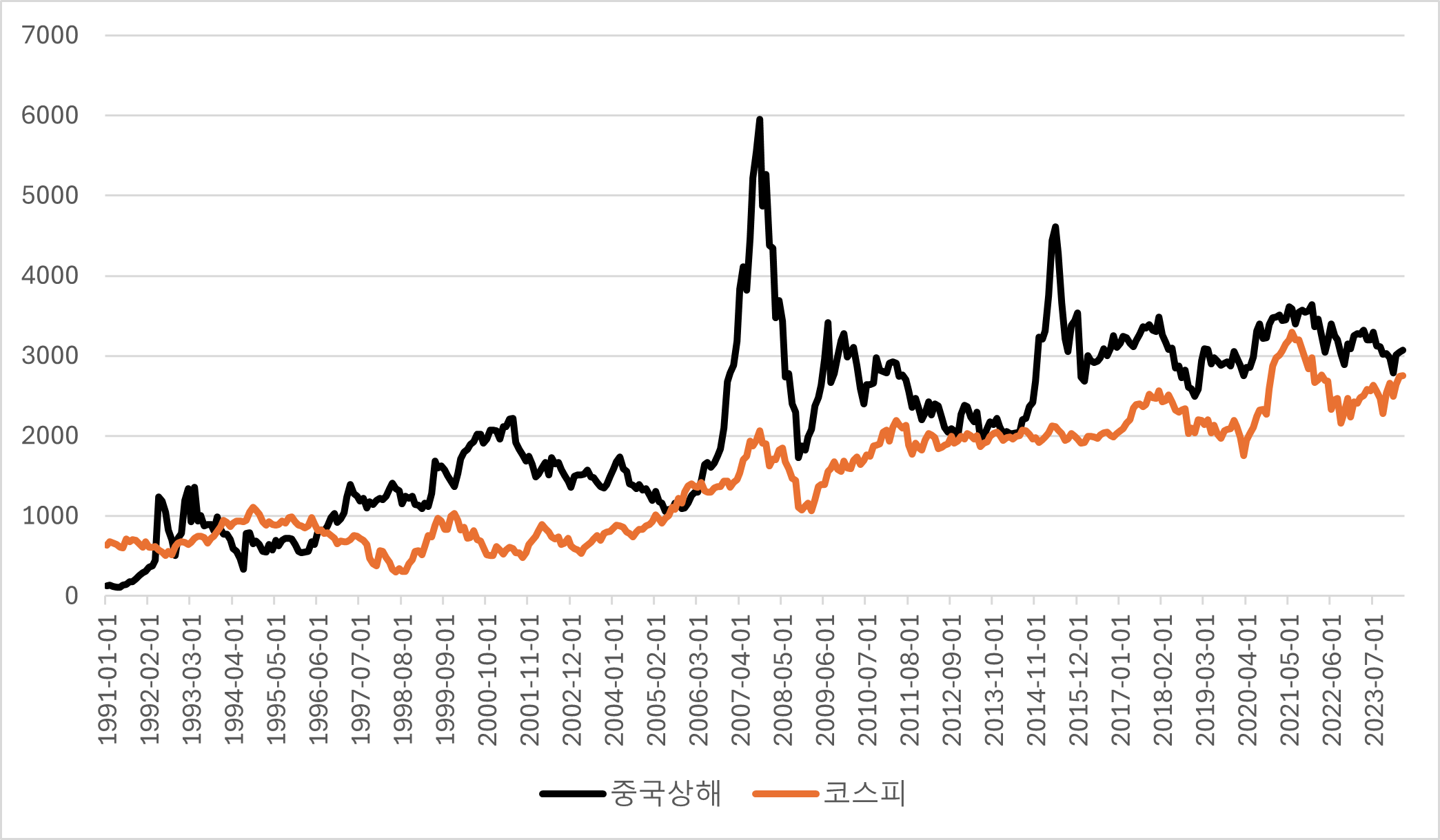 1990년 연초 이후 최근까지 중국증시와 한국증시의 상관계수가 0.06 수준에 불과하였습니다만, 2010년 이후로는 0.37 그리고 2020년 이후로는 0.47까지 상관계수가 높아졌습니다.
