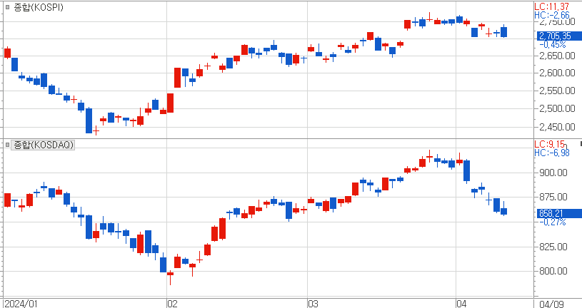 인플레이션이 쉽게 잡히지 않을 것이라는 분위기 속에 6월 FOMC 회의에서 기준금리 동결 가능성이 자주 언급되고 있습니다. 연초에 올해 중반부터 확연히 나타날 것으로 예상되었던 금리인하 분위기가 동결될 것이라는 분위기가 높이 올라오고, 국내 금융시장에서는 총선 이후에 미루어졌던 악재가 터질지 모른다는 불안감으로 인해 투자자들 사이에서는 증시 조정 가능성을 예상하는 경우를 자주 접하게 됩니다.