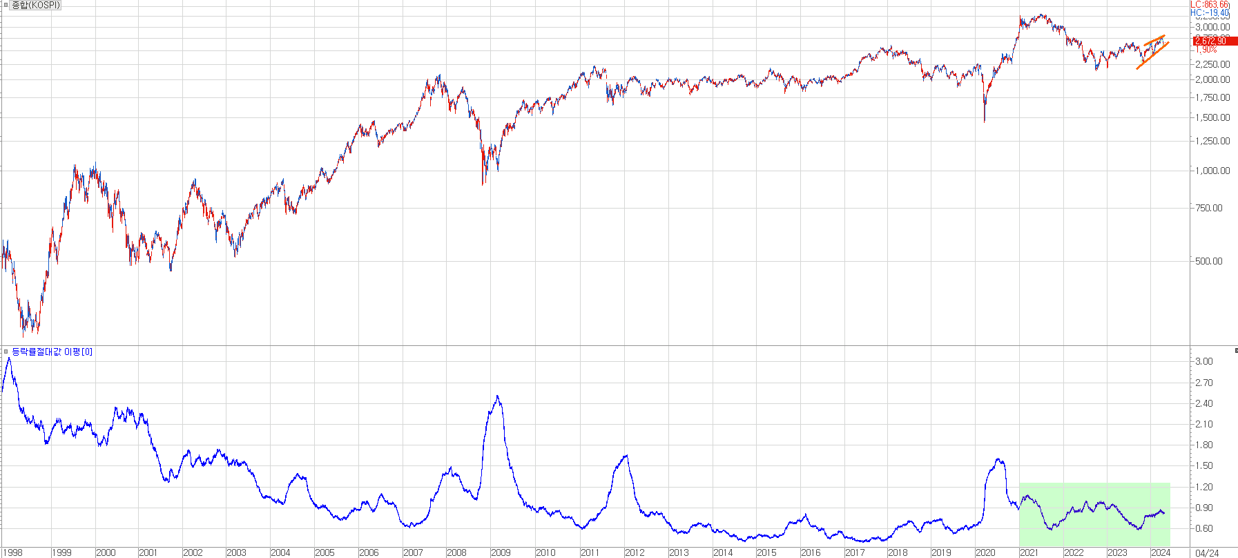 위의 자료는 1998년 이후 최근까지의 코스피 지수와 일간 등락률 절댓값의 이동평균선 지표를 함께 표시한 차트입니다. 한눈에 보시더라도 최근 2021년~2024년 영역과 비교하였을 때, 2010년대 초반까지만 하더라도 제법 높은 수준의 증시 변동성이 발생했음을 확인할 수 있습니다.