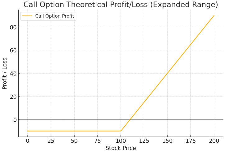 [ 콜옵션 매수의 이론 손익 구조도. 사진 : chatGPT/lovefund이성수 ]