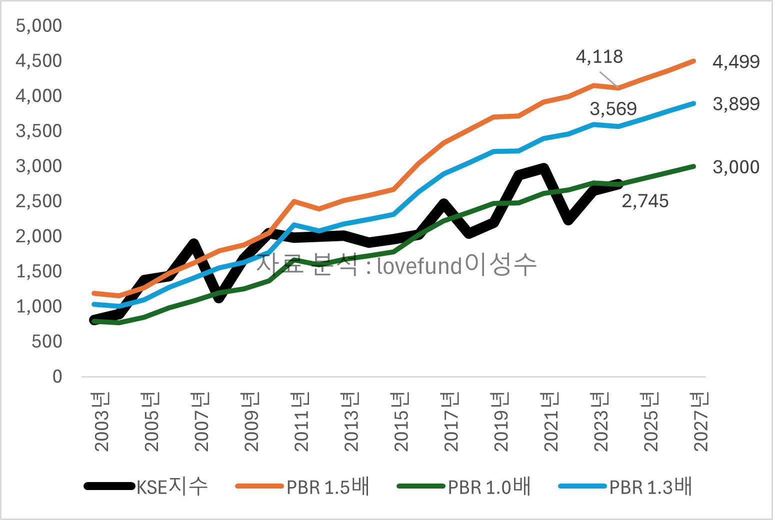 [ 2003년 이후 코스피 지수와 PBR밴드 1배, 1.3배, 1.5배_추이, 자료분석 : lovefund이성수 ]