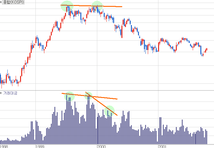 이때 직전 고점에 비해 거래대금이 감소할 경우, 이는 이전 고점을 뚫기에는 에너지가 부족한 상황을 암시합니다. 이런 상황에서 주가가 고평가되었거나 시장 돌발악재가 발생하면 주가는 허무하게 무너질 가능성이 커지게 되는 것이지요.