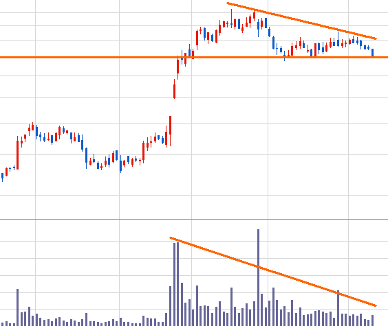 그러하기에 고평가되었다고 평가되는 종목이 주가가 쌍봉 또는 삼봉형 패턴을 만들고 이 과정에서 거래대금이 지속해서 감소하면서 심지어 주가 하락으로 인해 직전 저점까지 깨고 내려갔다면, 냉정한 투자 판단이 필요할 수 있지요.