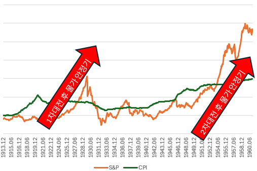 [ 1차, 2차 세계대전 전후의 S&P지수와 CPI지수 추이. 자료 참조 : 로버트실러 CAPE 자료 ]