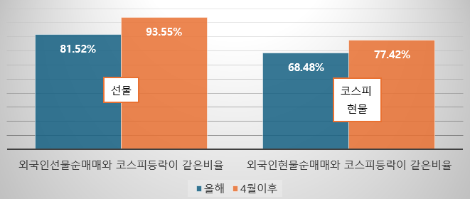 즉, 올해 외국인의 선물 순매매는 코스피 지수 등락률에 중요한 수급 변수로 부상한 것이지요. 특히나 4월 이후로는 총 31거래일 중 29일이 외국인 선물 순매매와 코스피 등락률이 같은 방향으로 움직였으니, 4월 이후 증시 체력이 떨어지면서 외국인의 선물 매매에 따라 증시가 좌지우지되는 현상이 노골적으로 나타나고 있는 상황입니다.