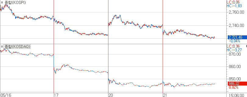 [ 지난주 후반 이후 무겁게 움직이고 있는 코스피와 코스닥 시장의 분봉차트 ]