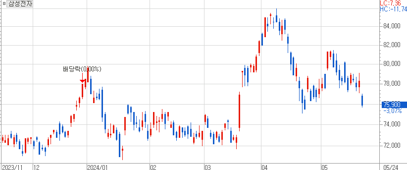 바로 오늘 5월 24일 금요일 삼성전자의 주가는 장중 3% 넘게 하락하는 흐름을 만들고 말았습니다. 코스피 시가총액 1위의 대들보와 같은 삼성전자로서는 3%가 넘는 주가 하락은 폭락이라 해도 과언이 아니지요. 그렇다면, 삼성전자의 주가 마지노선은 어디일까요?