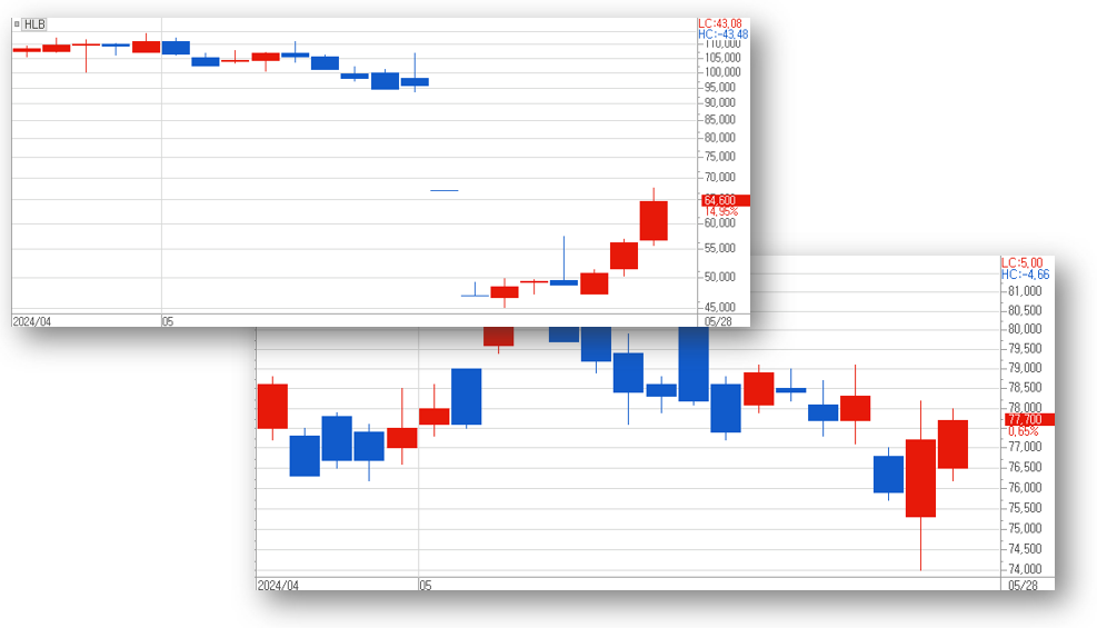 [ HLB와 삼성전자의 5월 주가 흐름 : 급등락 속에 혼란스러운 주가 ]