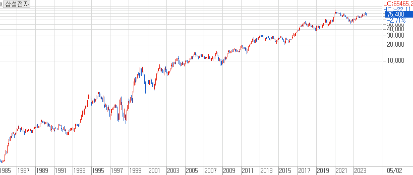 어떤 이는 삼성전자의 주가 장기 추세를 보면서 먼 옛날 부모님은 왜 삼성전자를 사두지 않았는지 한탄하기도 합니다. 그러고 보니 1980년대 중반과 비교해 보면 삼성전자의 주가는 수백 배 상승하였으니 그렇게 말할 만도 합니다. 최근 3년여 삼성전자의 주가가 힘이 없었지만, 10년 전과 비교 해 봐도 삼성전자 주가는 2.6배 상승하였고, 20년 전과 비교 해 보면 7배 넘게 상승하였으며, 30년 전과 비교하면 50배 넘게 상승하였습니다.