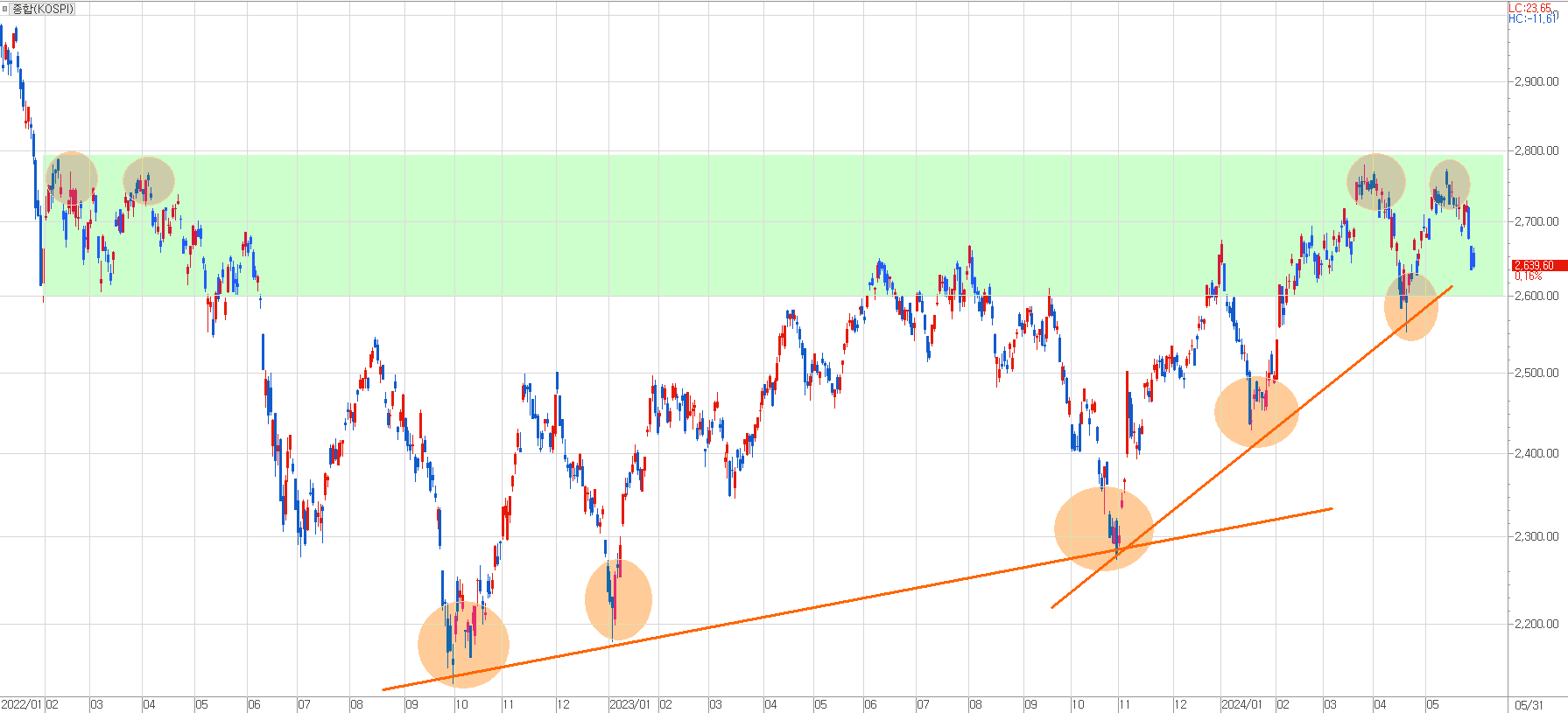 5월 초만 하더라도 4월 말 반등 탄력이 있었다보니 그런대로 분위기가 나쁘지는 않았습니다. 하지만, 2022년 이후 주식시장의 마의 영역으로 굳어져 있는 주가지수 2,700p 영역에서 한국 증시는 매물 압박에 시달리고 말았습니다.