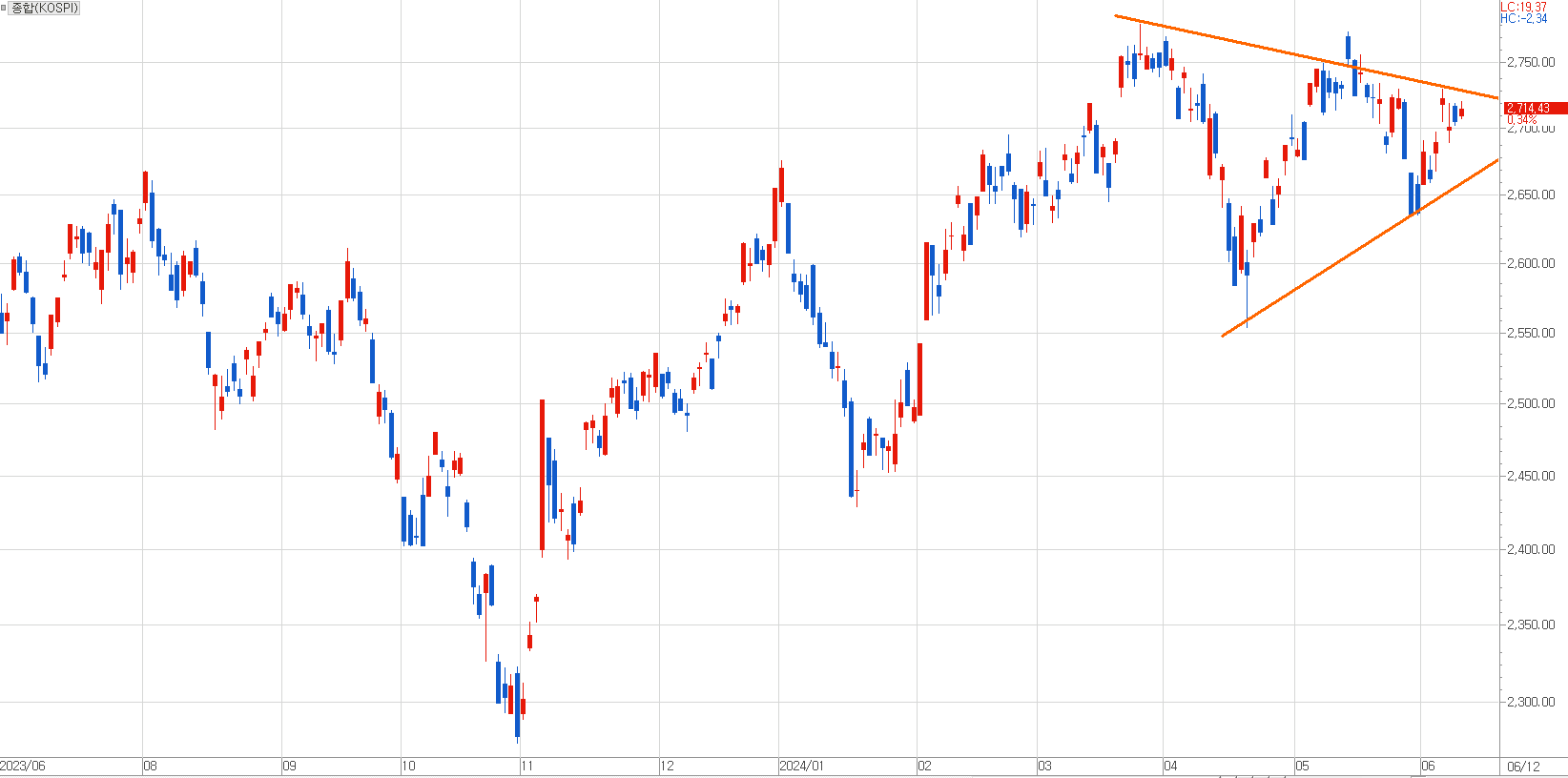위로 튀어 오르려 하더라도 코스피 2,750p 근처에서 저항에 부딪히고, 하락장이 오더라도 2,600p 부근과 2,650p 부근에서 지지받으면서 반등이 이어지며 코스피 2,700p를 꼭짓점으로 좁은 삼각형 형태의 박스권이 만들어져 있습니다.