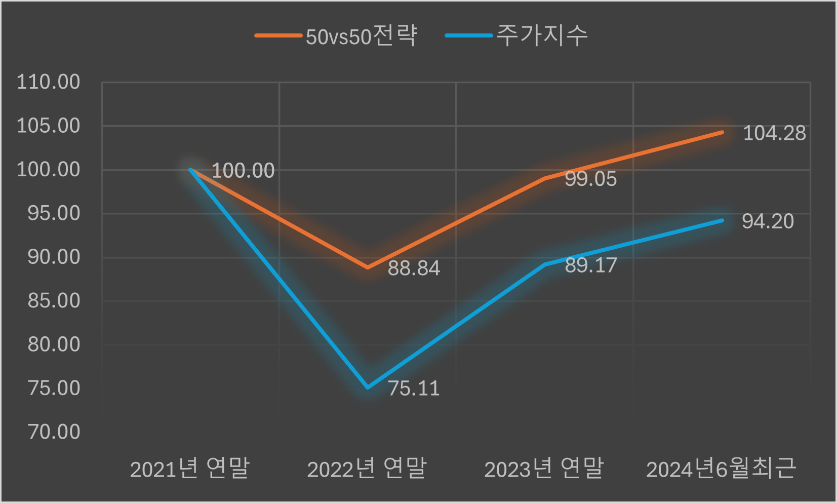 (※ 비교를 위해 주가지수와 50vs50자산배분전략 모두 2021년 연말을 100p로 기준을 잡았습니다.)
